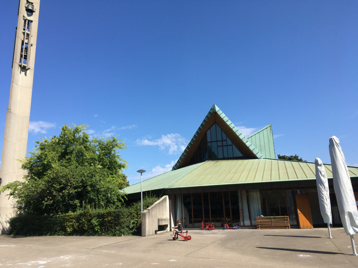 Der nach Art eines Campanile frei stehende vierzig Meter hohe Glockenturm setzt einen markanten Akzent, der im Dialog mit dem Gebäude wirkt. Drei Glocken mit den Schlagtönen ges′, as′ und ces″ hängen offen übereinander. Drei Bronze-Engel am Kirchturm hat Hans Geissberger geschaffen.
